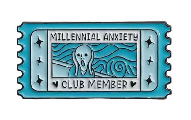 Join the Millennial Anxiety Club with this pin badge! Featuring millennial angst, this quirky accessory is perfect for those who don't take themselves too seriously. Wear it proudly and show off your sense of humor (and your generational struggles).