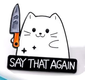 Keep your wit sharp (or should we say "claw"?) with our Say That Again... enamel pin badge. Featuring a clever cat wielding a knife, this pin adds a playful touch to any outfit. Perfect for cat lovers and those who appreciate a good pun (meow or never!).